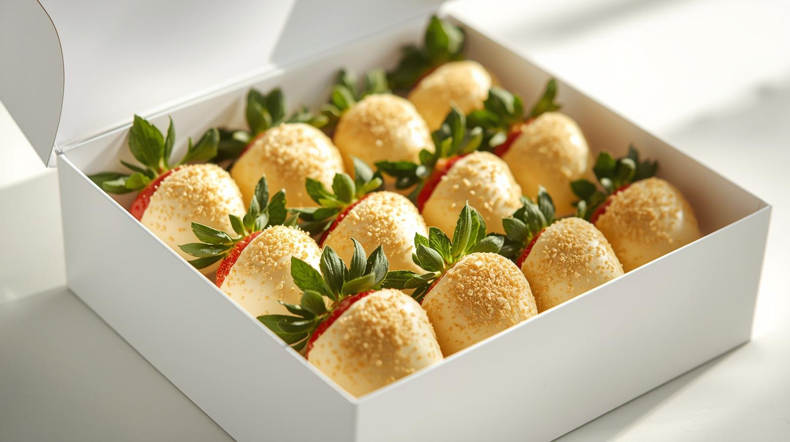 Indulge in a playful twist on a classic dessert. Our Banana Pudding Flavor Chocolate-Covered Strawberries feature ripe, juicy berries enrobed in a vibrant yellow chocolate and finished with a delicate vanilla wafer crumble, flavored to evoke banana pudding. The result is a harmonious balance of bright fruit, buttery-yellow chocolate, and a nostalgic, crumbly bite that recalls your favorite Banana Pudding moments.